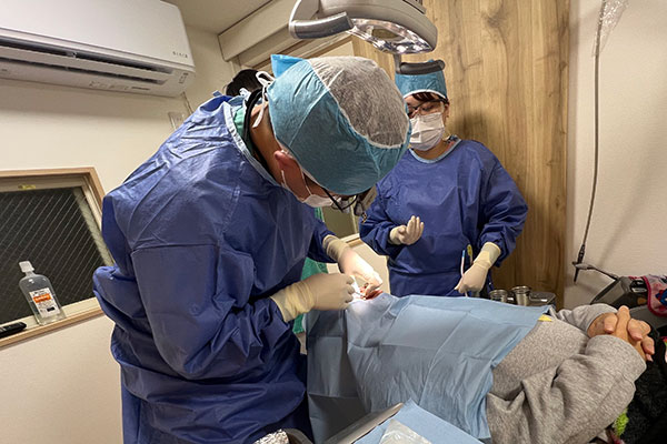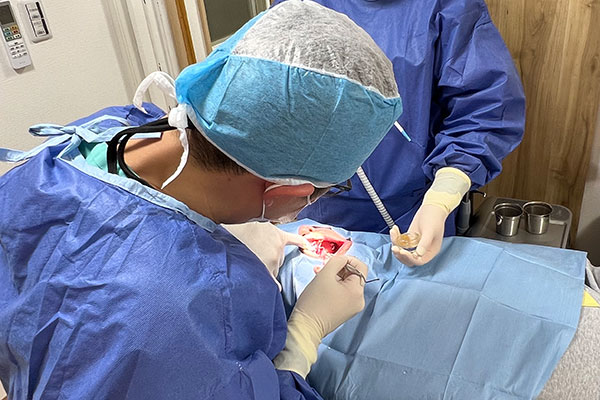 骨造成を促したい部分に、骨補填剤と血清成分を混ぜ合わせたものを充填,血漿成分から得たメンブレンで覆い縫合して終了です。