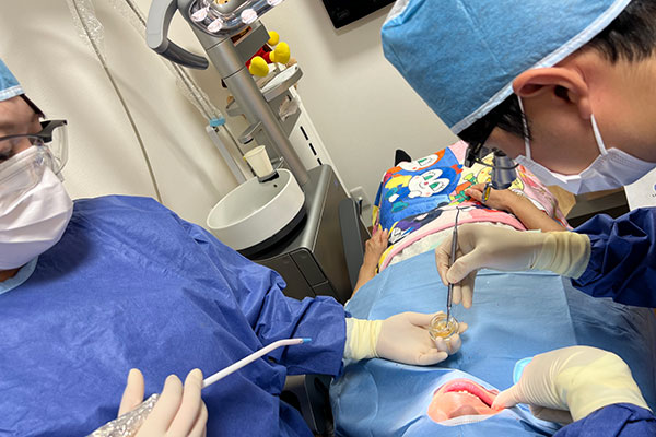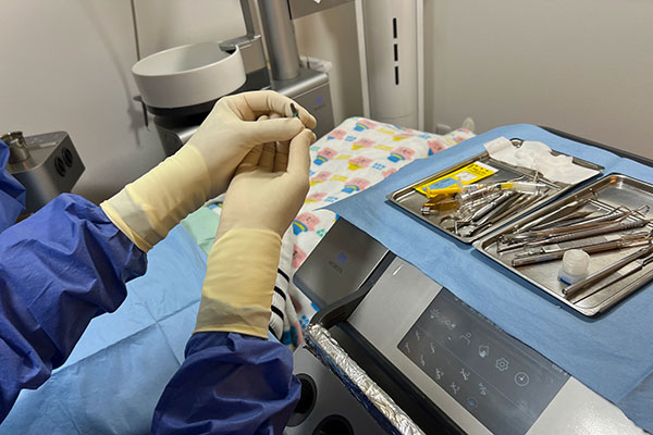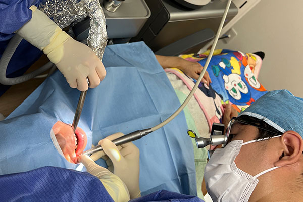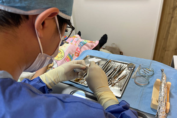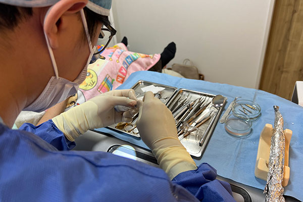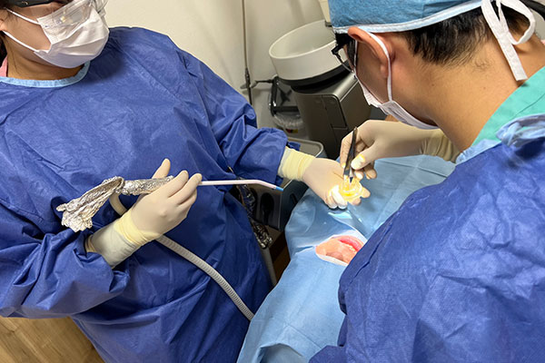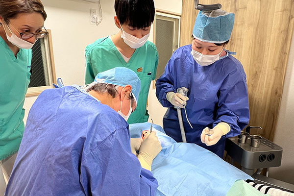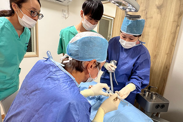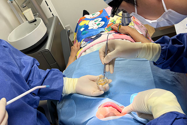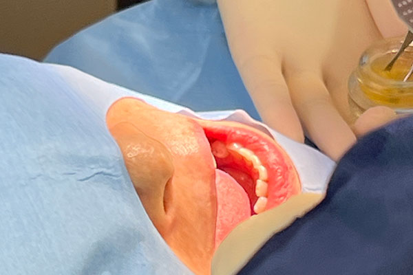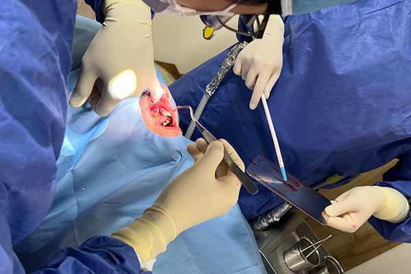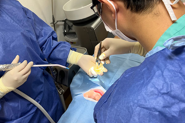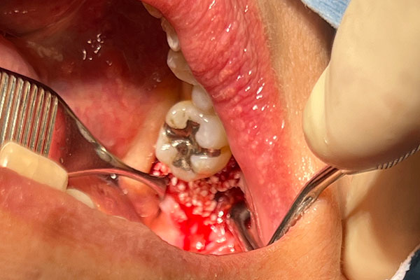 そのあと、ディコルチケーション(骨の硬い部分に多数の小さな穴を開け、再生を促す方法)を行い、骨造成を促したい部分に血清成分と骨補填材を混ぜ合わせたものも入れていきます。