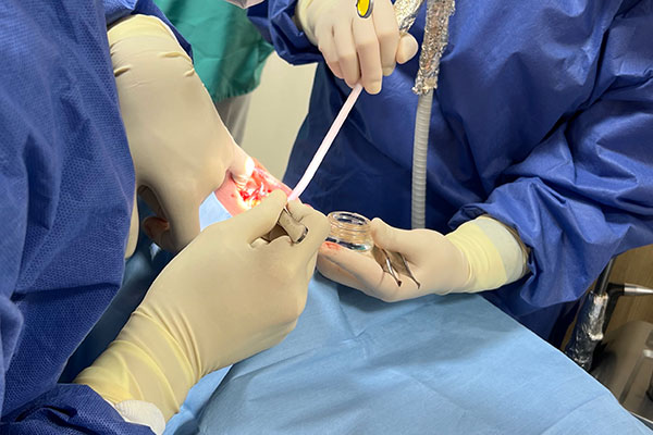 切開・剥離後、鋭匙とヤグレーザーを用い不良肉芽を丁寧に取り除きます。