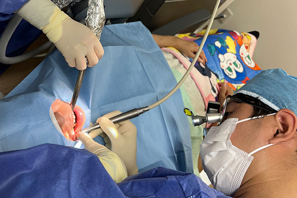 そのあと、ディコルチケーション(骨の硬い部分に多数の小さな穴を開け、再生を促す方法)を行い、骨造成を促したい部分に血清成分と骨補填材を混ぜ合わせたものも入れていきます。