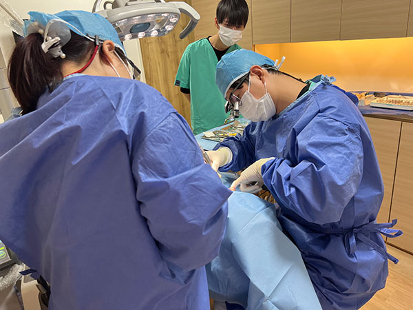 2本の埋入が完了後、骨が不足している部分に術前の採血にて得た患者さんの血清成分と骨補填剤を混ぜ合わせ充填、血漿成分から得たメンブレンにて覆い縫合して終了です。